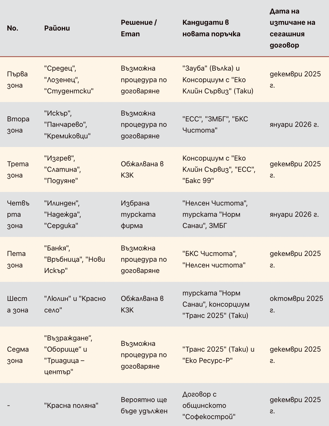 „Красно село“ и „Люлин“ остават без договори, като същата съдба застрашава “Подуяне”, “Слатина” и “Изгрев”, тъй като сега действащите услуги ще бъдат прекратени на 1-ви декември. Кметът на район “Подуяне” Кристиян Христов обяви, че се готви за кризисна ситуация.